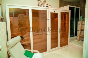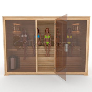 Это специально оборудованная готовая деревянная кабина для сухого и влажного парения. Электропечь нагревает пространство внутри и позволяет сбрызгивать камни водой, слегка увлажняя воздух. Такая процедура позволяет избежать перегрева. Сауна обшита снаружи и внутри кедровой вагонкой и имеет теплоизоляционный слой. Финская сауна с электропечью подойдет, как для домашнего использования, так и для коммерции. Доставляется в разборном виде щитами, собирается по инструкции с помощью шуруповёрта.